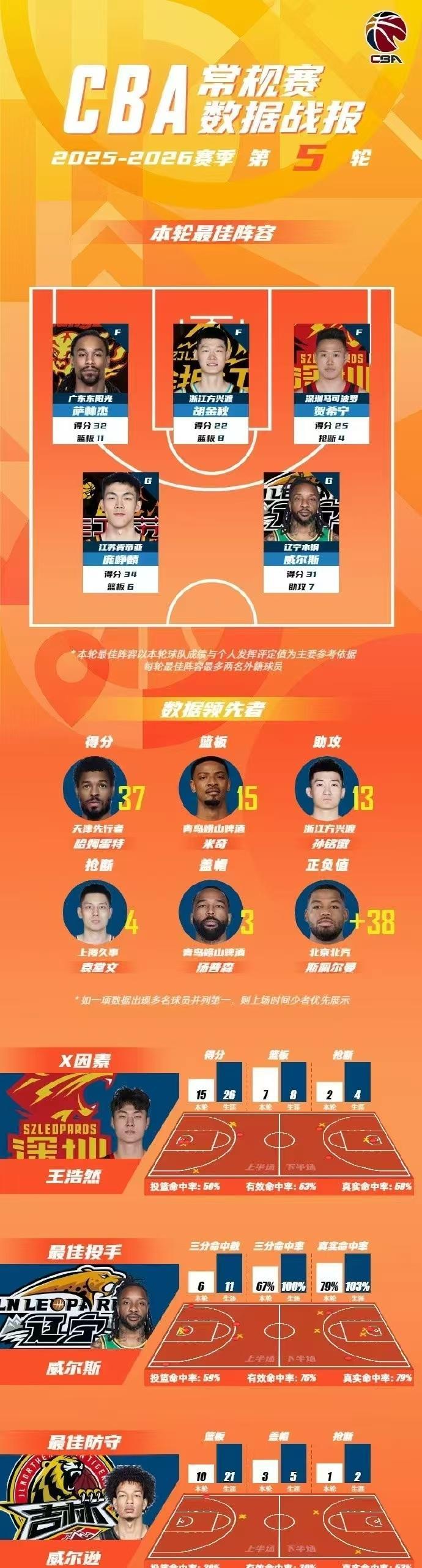 CBA官宣常规赛第5轮最佳阵容,新科探花庞峥麟34+6创生涯得分纪录,也是再次刷新本届新秀单场最高分纪录领衔入选,萨林杰32+11与威尔斯31+7入选,胡金秋22+8与贺希宁25分也上榜。